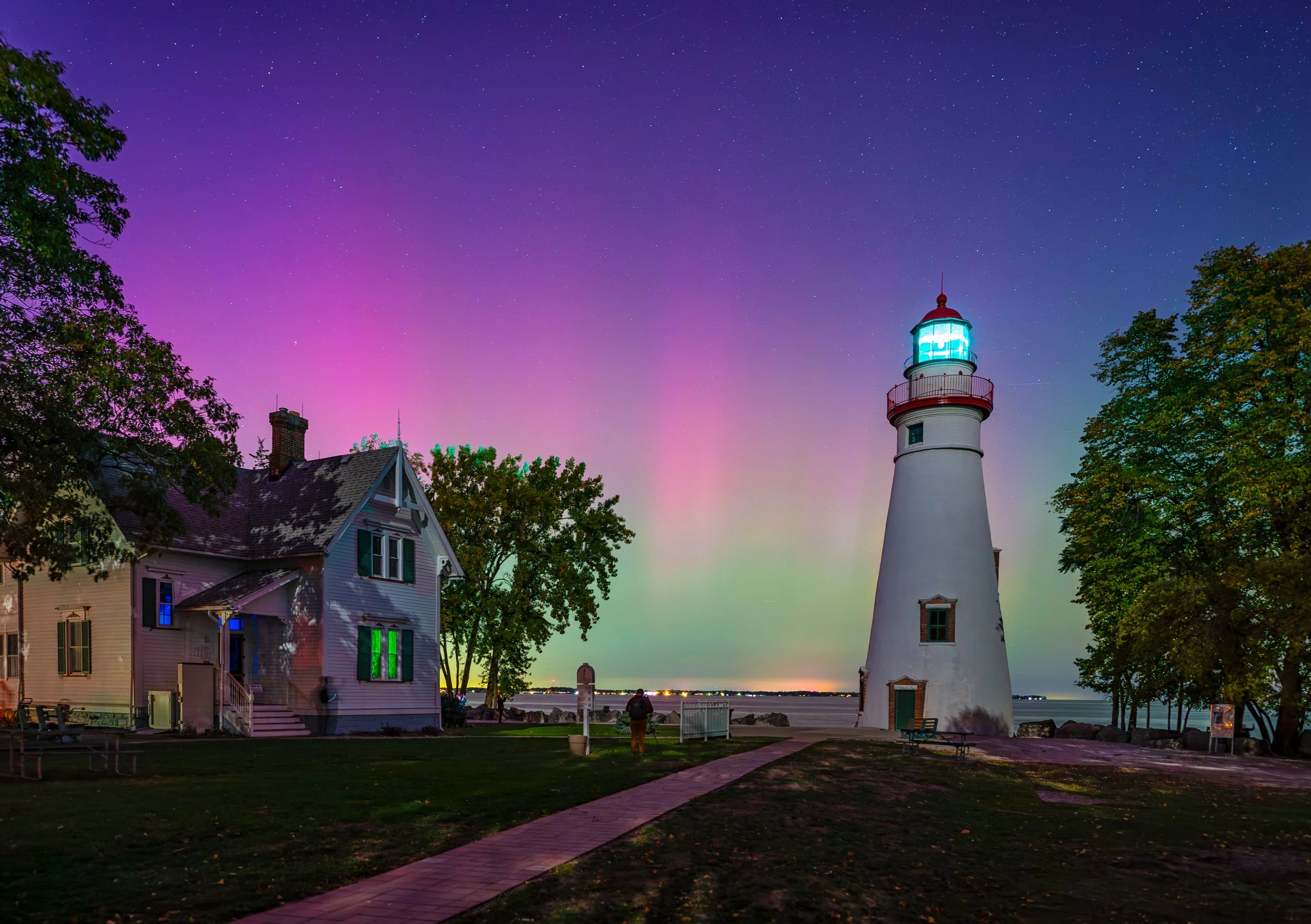 The pillars of magenta and emerald begin to paint the night sky at Marblehead Lighthouse State Park, Marblehead, Ohio, on October 10-11, 2024.