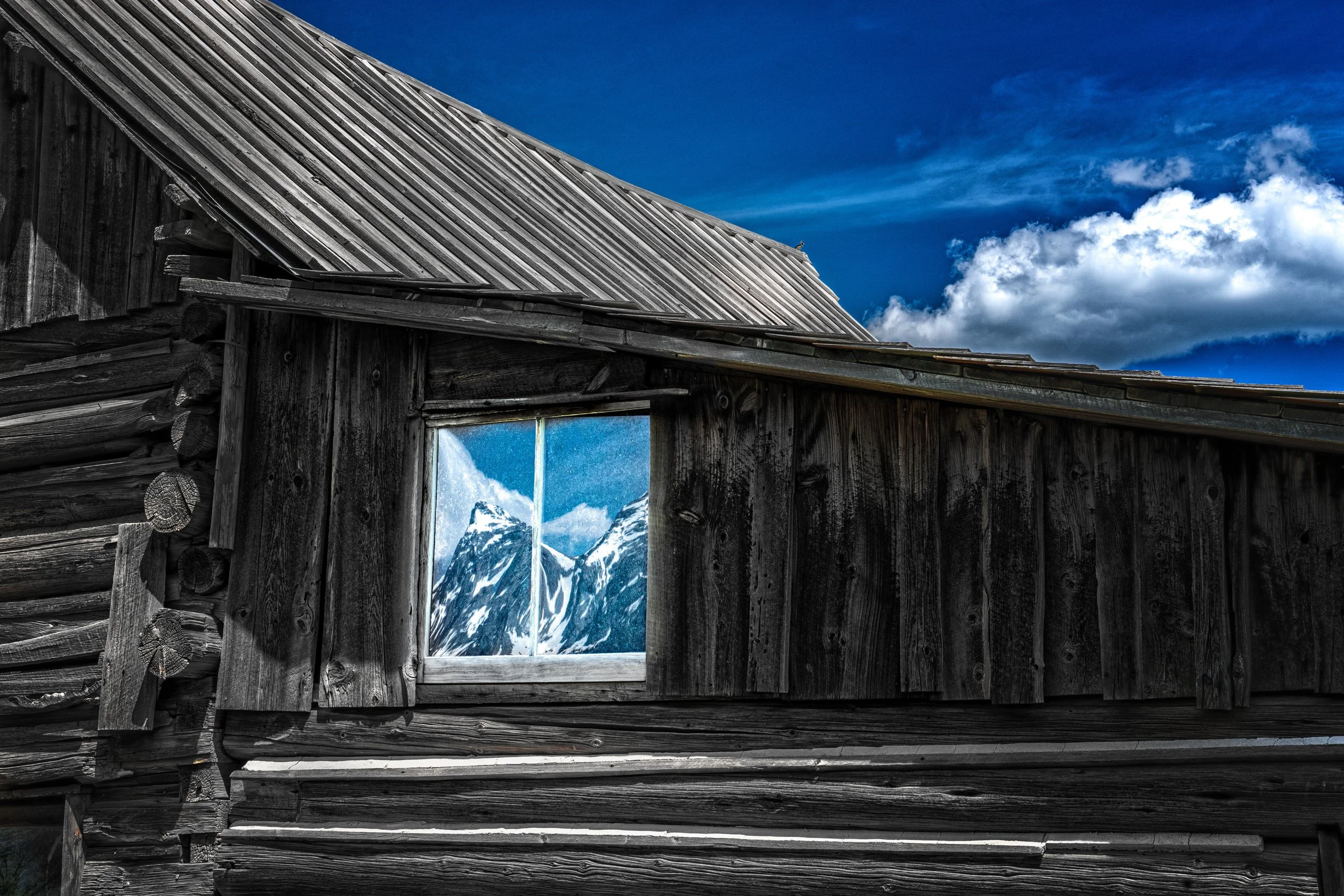 One of the peaks of the Tetons reflected in a window of the T.A. Moulton Barn in Grand Teton National Park, Wyoming.